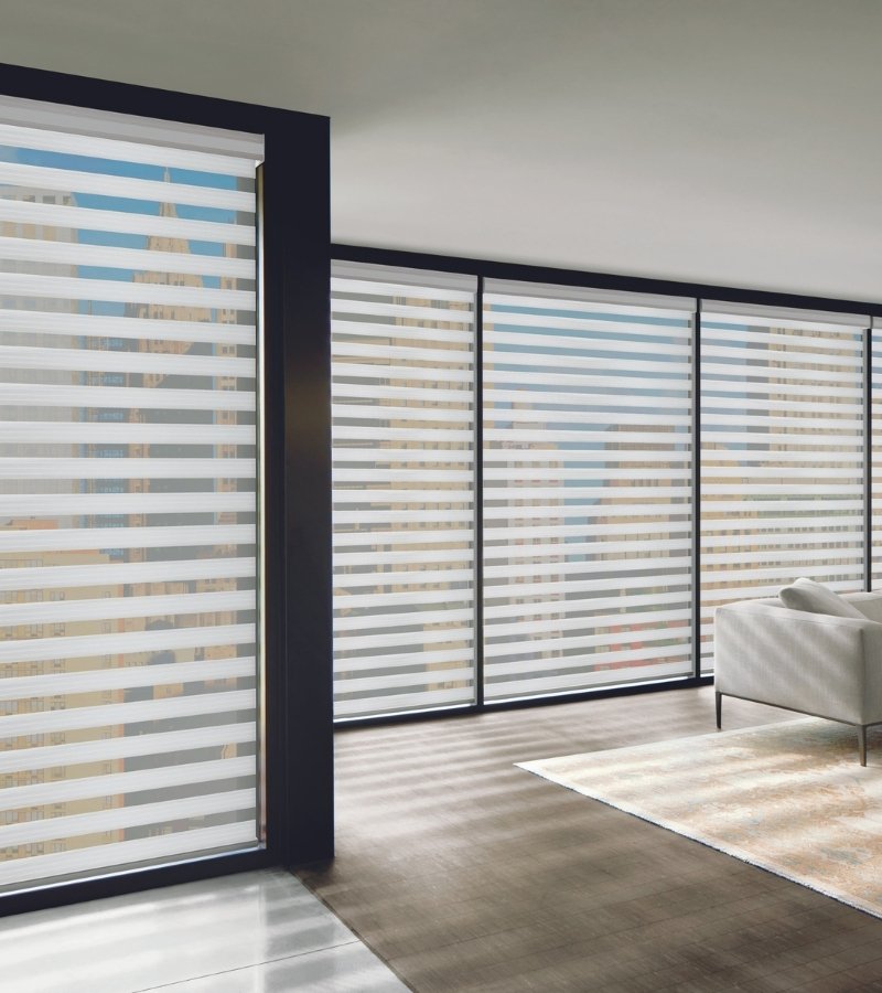 Dual shades feature two layers of fabric that move independently of each other. By adjusting the position of the layers, you can achieve varying levels of light filtration and privacy. When the opaque stripes align, they block out light and provide privacy, while aligning the sheer stripes allows diffused light to enter the room.